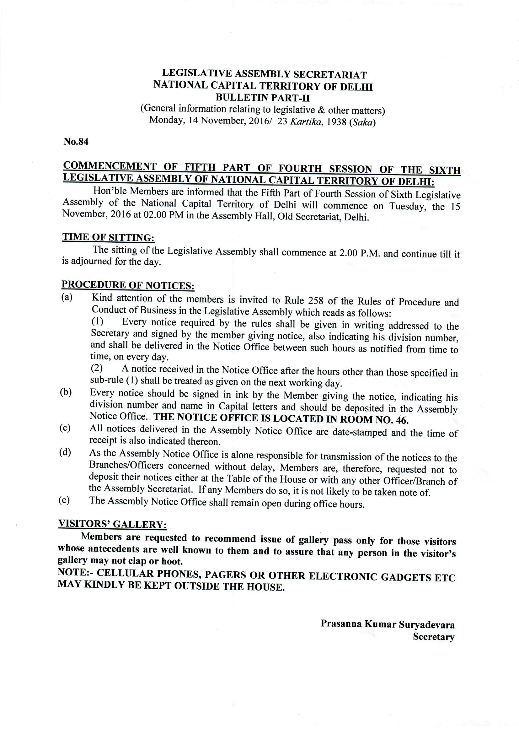 | 84 | Commencement of Fifth part of Fourth Session of the Sixth Legislative Assembly of National Capital Territory of Delhi |